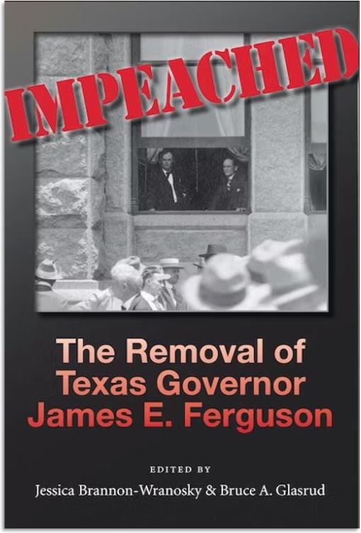 In 1917, barely into his second term as governor of Texas, James E. Ferguson was impeached, convicted, and removed from office. Impeached provides a new examination of the rise and fall of Ferguson’s political fortunes, offering a focused look at how battles over economic class, academic freedom, women’s enfranchisement, and concentrated political power came to be directed toward one politician. Jessica Brannon-Wranosky and Bruce A. Glasrud have brought together top scholars to shine a light on this unique chapter in Texas history. An overview by John R. Lundberg offers a comprehensive survey of the impeachment process. Kay Reed Arnold then follows the Ferguson story into the halls of academia at the University of Texas—which Ferguson threatened to close—sparking a fierce response by faculty, alumni, students, and, especially, the Women’s Committee for Good Government. Rachel M. Gunter further places the Ferguson impeachment in the context of the suffrage movement. Leah LaGrone Ochoa then explores Ferguson’s hot-and-cold relationship with the Texas press, and Mark Stanley examines the impact of the impeachment on Texas politics in the decades that followed. Jessica Brannon-Wranosky concludes with an assessment of the historical memory of Ferguson’s impeachment throughout the twentieth and twenty-first centuries. Impeached: The Removal of Texas Governor James E. Ferguson reveals how power ebbed and flowed in twentieth-century Texas and includes several annotated primary documents critical to understanding the Ferguson impeachment. A copy of this book can be purchased from Texas A&M University Press at https://www.tamupress.com/book/9781623495275/impeached/ or at most online and storefront booksellers.