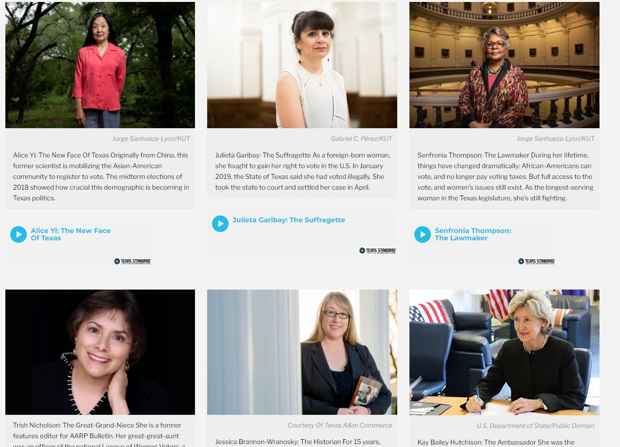 “The summer of 1919 brought about a sea change in American politics. On June 4 of that year, Congress took the monumental step of granting women the right to vote by passing the 19th Amendment. It next went to the states for ratification. Although women in Texas had been voting in primaries for a year before the historic 1919 vote, June [2019 marked] the 100th anniversary that opened the door for women to vote nationwide. These are the stories of civic-minded Texas women who are changing our world today inspired by a fundamental right: the right to have one’s voice heard.” The series featured “Maxine Barkan: The Centenarian,” “Grace Chimene: An Original and President of the League of Women Voters of Texas,” “Cristina Tzintzun: The Game Changer,” “Alice Yi: The New Face Of Texas,” “Julieta Garibay: The [Modern] Suffragette,” “Senfronia Thompson: The Lawmaker,” “Trish Nicholson: The Great-Grand-Niece of Minnie Fisher Cunningham,” “Jessica Brannon-Wranosky: The Historian,” “Kay Bailey Hutchison: The Ambassador and Former U. S. Senator,” “Daria Vera: The Marcher,” “Ada Villafañe: The Activist,” and “Sheri Doss: An Original and First African American Woman President of the Texas Congress of Parents & Teachers (PTA).” The individual Texas Standard segments interviewing each can be accessed openly and without cost to listeners at https://www.texasstandard.org/100years/.
